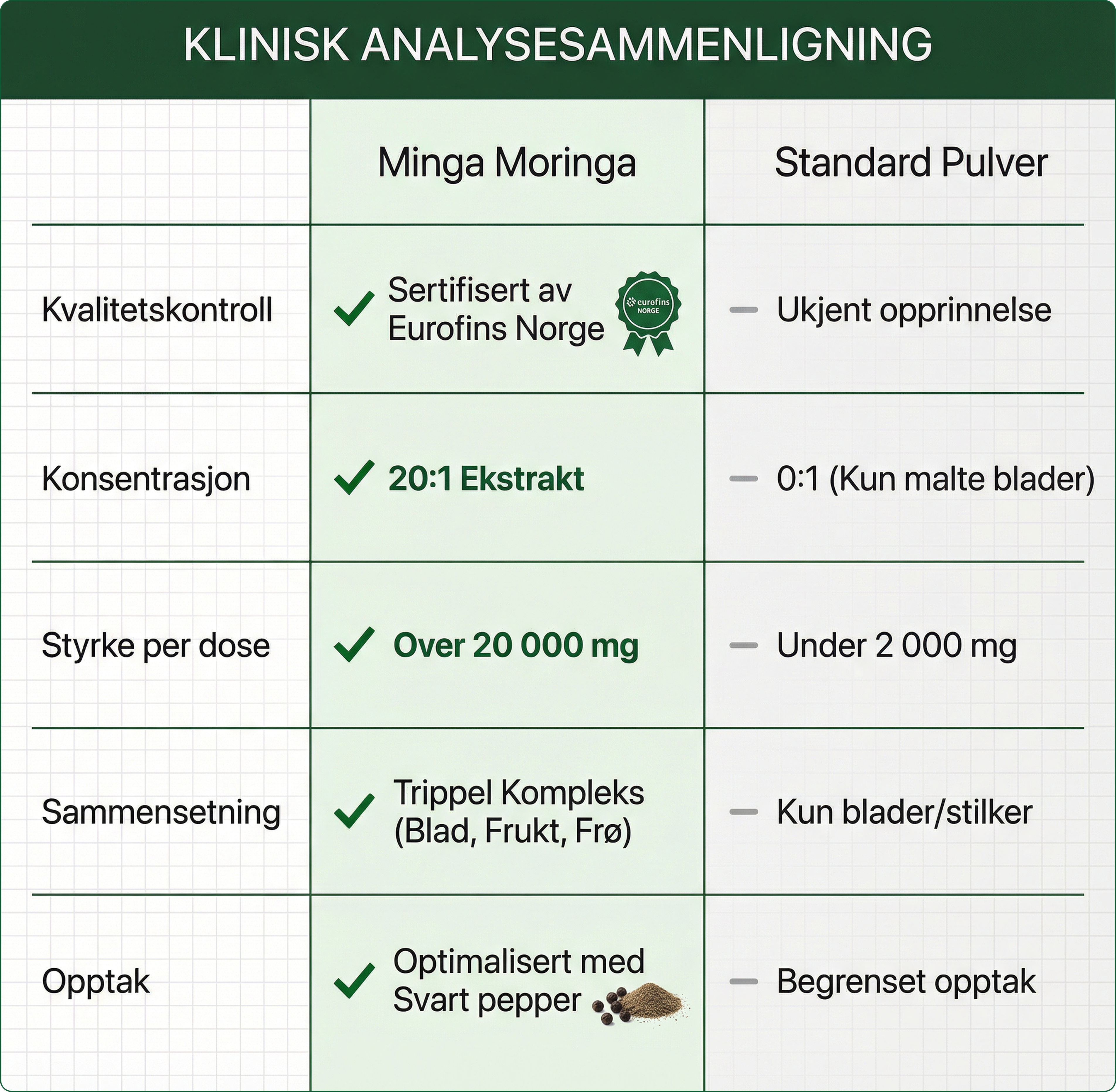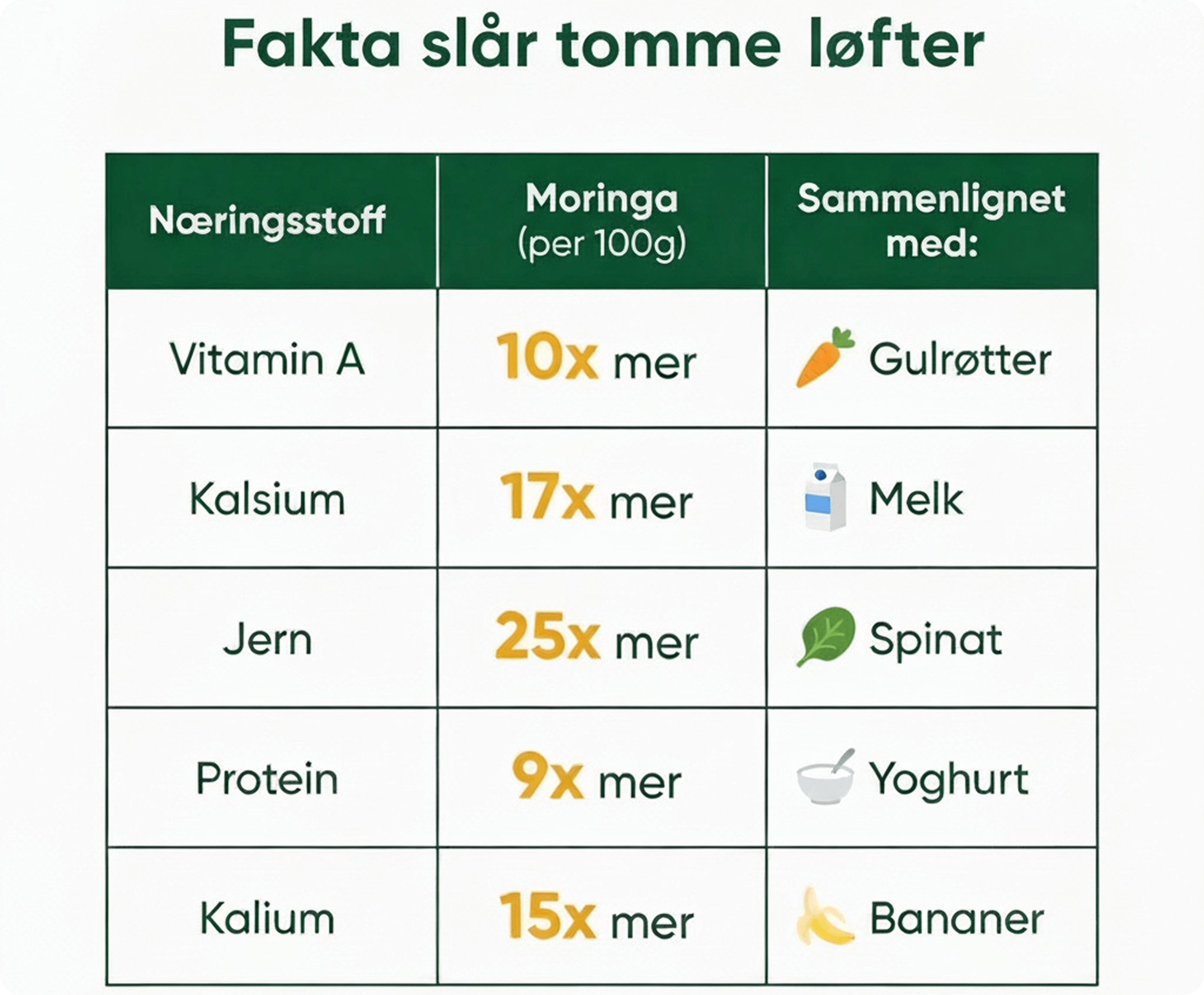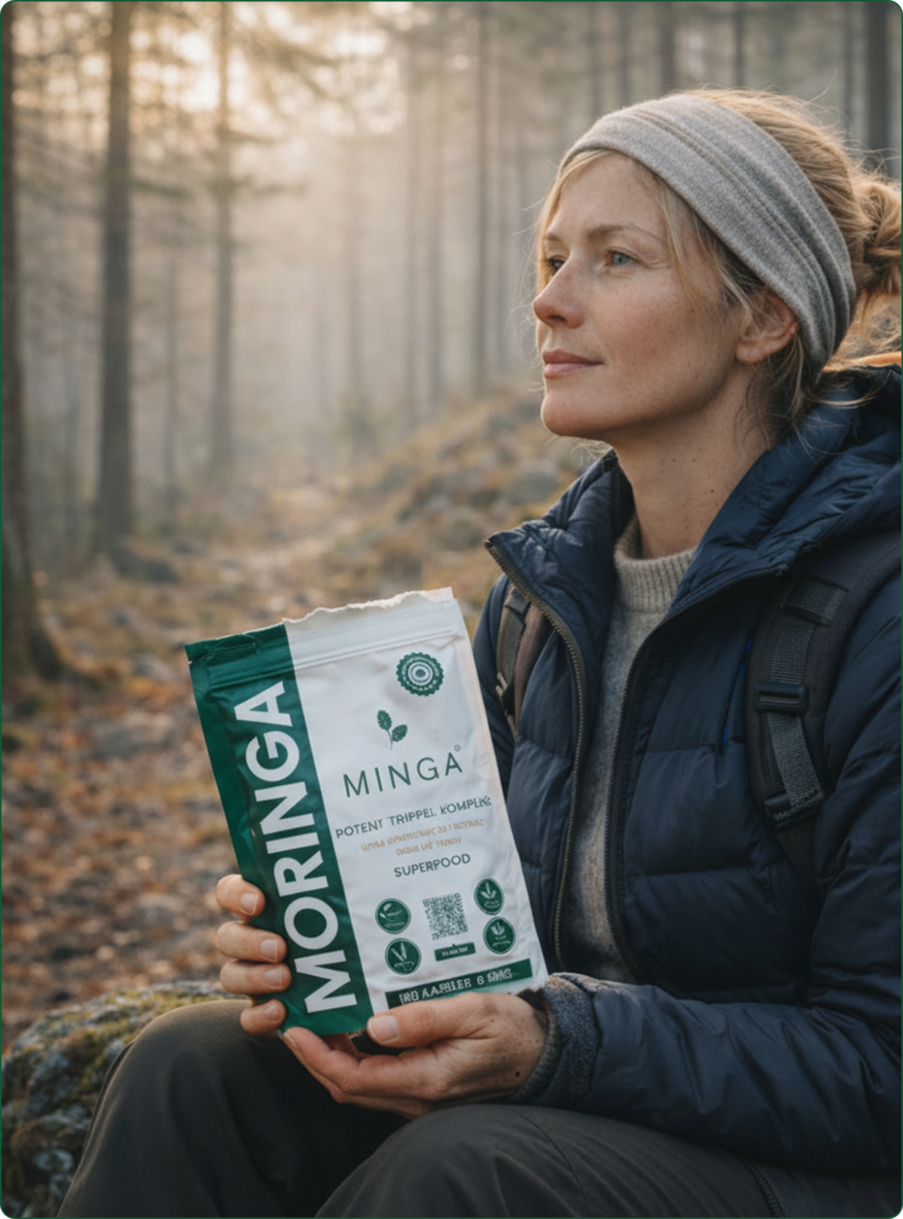 Du kan fylle på med så mye drivstoff (mat og vitaminer) du vil, men uten de riktige næringsstoffene og bioaktive forbindelsene, starter ikke energiproduksjonen ordentlig. Moringa er rik på viktige næringsstoffer som støtter normal energi, bedre fordøyelse og beskytter kroppen på cellenivå – på en naturlig og plantebasert måte.